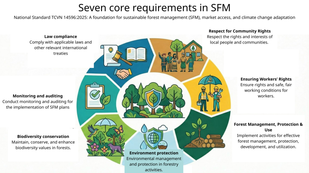 TCVN 14596:2025 specifies sustainable forest management requirements applicable to forest owners and managers of trees outside forests, and will be applied within the Vietnam Forest Certification Scheme (VFCS/PEFC).